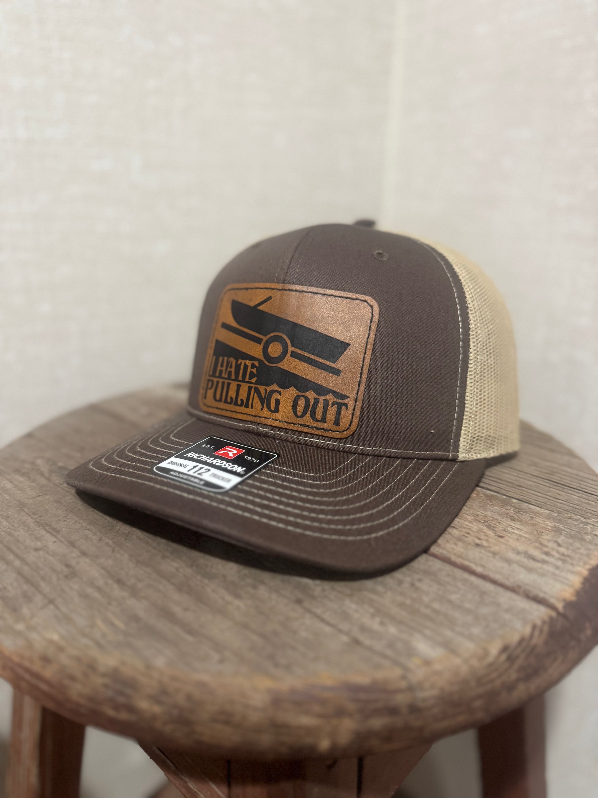 “I hate to pull out” ,precision-engraved black leather patch on the classic Richardson 112 trucker cap.